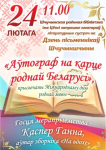 24 лютага ў Шчучынскай раённай бібліятэцы імя Цёткі адбылася цёплая і натхняльная сустрэча, прысвечаная Міжнароднаму дню роднай мовы. Госці сабраліся на Дзень пісьменнікаў Шчучыншчыны пад назвай “Аўтограф на карце роднай Беларусі”. Асаблівай госцяй мерапрыемства стала таленавітая пісьменніца Ганна Каспер. Яна падзялілася з прысутнымі сакрэтамі творчасці, расказала пра свае кнігі і, канешне, падаравала ўсім прысутным радкі сваіх вершаў. Удзельнікі сустрэчы гаварылі пра тое, як важна шанаваць роднае слова і захоўваць культурную спадчыну. Кожны змог адчуць сябе часткаю вялікай літаратурнай сям’і, дзе беларуская мова жыве і квітнее.